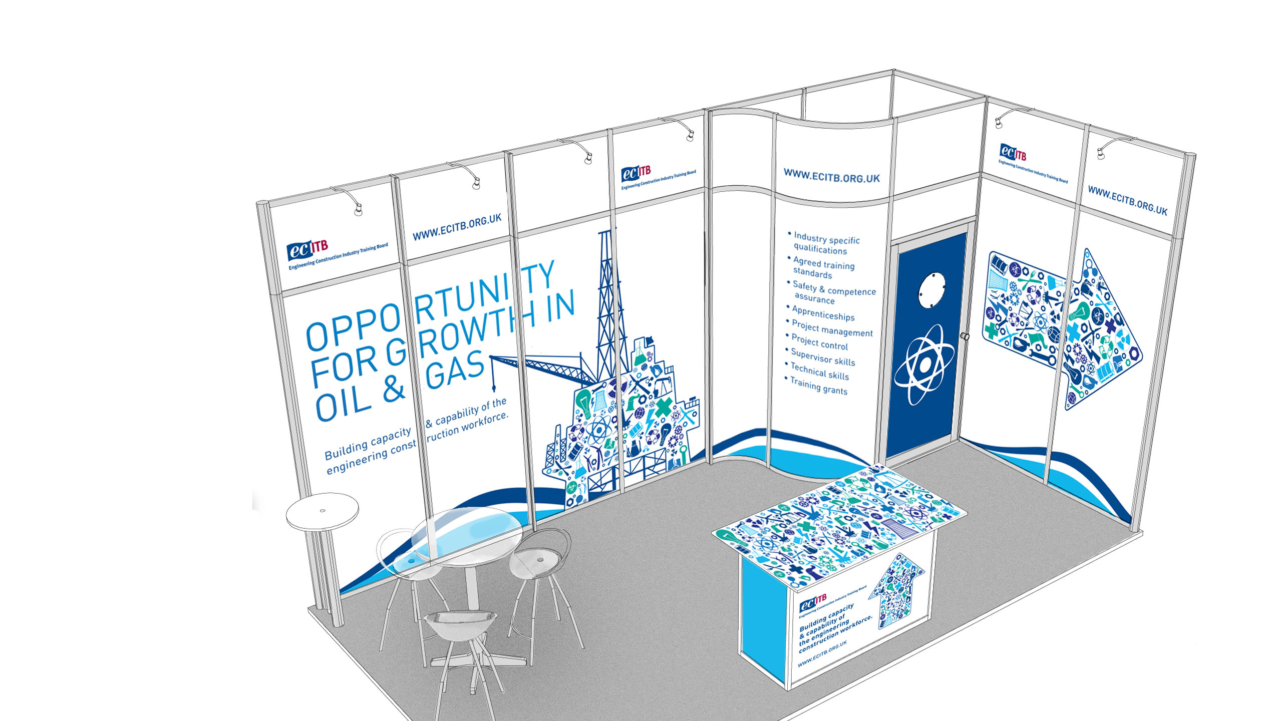 We were commissioned to design, print and build a 5 x 4m stand for ECITB's Offshore Europe event in Aberdeen together with supporting printed material.